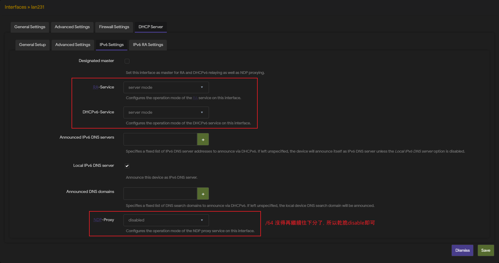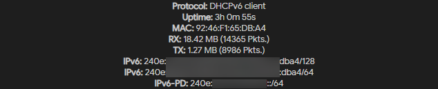 由於不希望魔改成橋接來聯網,經過下面的設備會經過一層運營商的路由器,也就是說我的路由器設備是使用 DHCPv6 去聯網的,這樣子 PD 會有 /64 的問題,換句話説 /64 的子網沒辦法爲下面的三個網段劃分子網,只能給其中一個網段,因爲 /64 已經不能再分了。