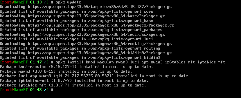 opkg update opkg install kmod-macvlan mwan3 luci-app-mwan3 ip6tables-nft iptables-nft