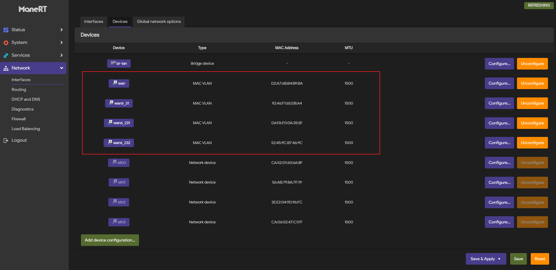 首先我要虛擬3個wan6網卡,同時向運營商給的路由器獲取ipv6,因爲我需要3個PD段,另外加一個 wan 是使用ipv4的,所以加起來就有4個wan,參考官方的寫法是。