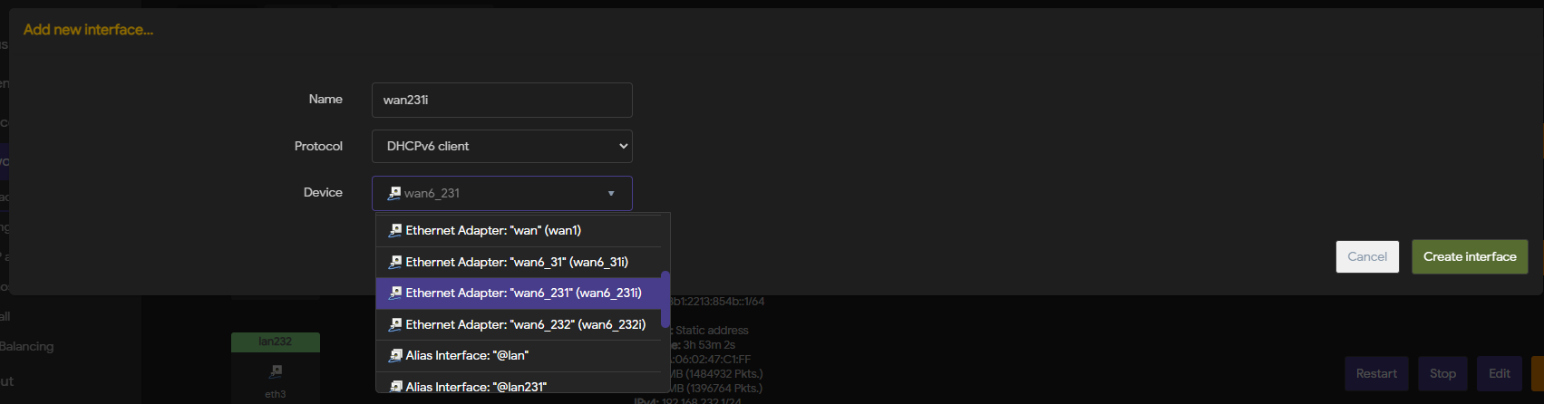 option gateway '192.168.1.1'由於只是虛擬了設備,虛擬好了設備需要設置好接口才可以使用,對於 wan6_231 的設備增加一個interface為 wan6_231i