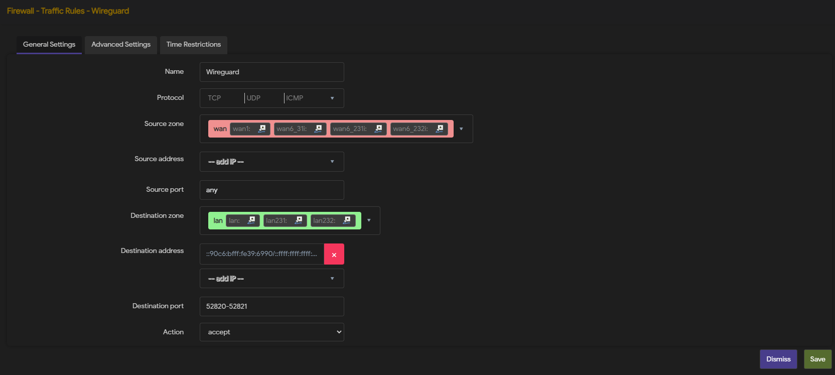 ipv6 设置方法跟 ipv4 不一样,它的地址比较长,由八组字母数字组成 [1:2:3:4:5:6:7:8,一般情况下,拨号获得的 ipv6 地址前四段变化,后四段是根据本地 mac 网卡来的,所以后四段不变。那么 ipv6 防火墙目标地址就用通配符来设定,[0:0:0:0:5:6:7:8/0:0:0:0:ffff:ffff:ffff:ffff,前面 0:0:0:0 缩写成两个”::”, 所以目标地址填写 [::5:6:7:8/::ffff:ffff:ffff:ffff], 其中 5:6:7:8 是所指向 lan 被访问主机 ipv6 地址的后四段。