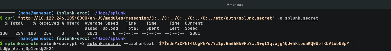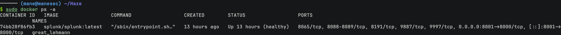 $ sudo docker run -d -p 8000:8000 -e SPLUNK_START_ARGS='--accept-license' -e SPLUNK_PASSWORD='manesec' splunk/splunk:latest