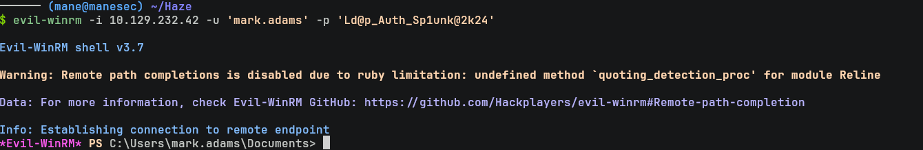 haze.htb\mark.adams:aes256-cts-hmac-sha1-96:bb930bfb3394a8c79eb614c66f2cf7af23e1aaec9a209ff370a8a1ae67771fc4