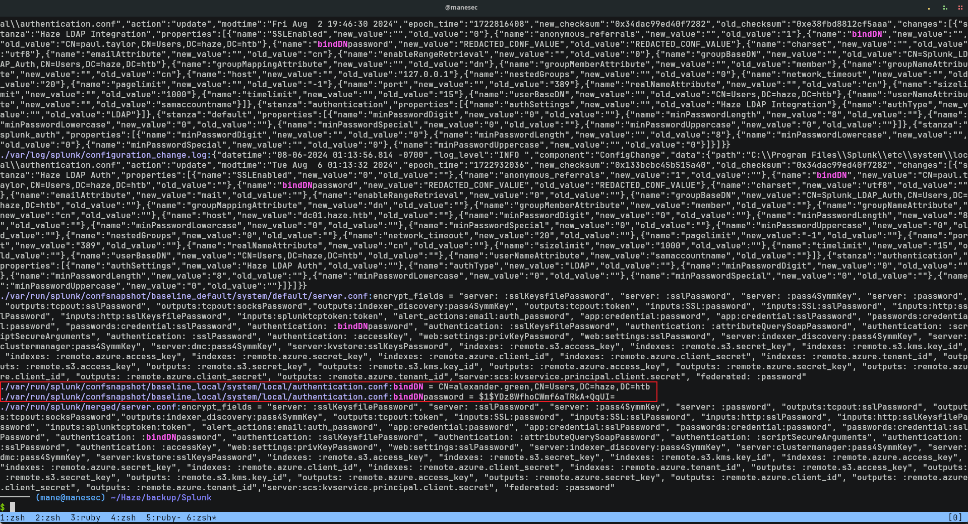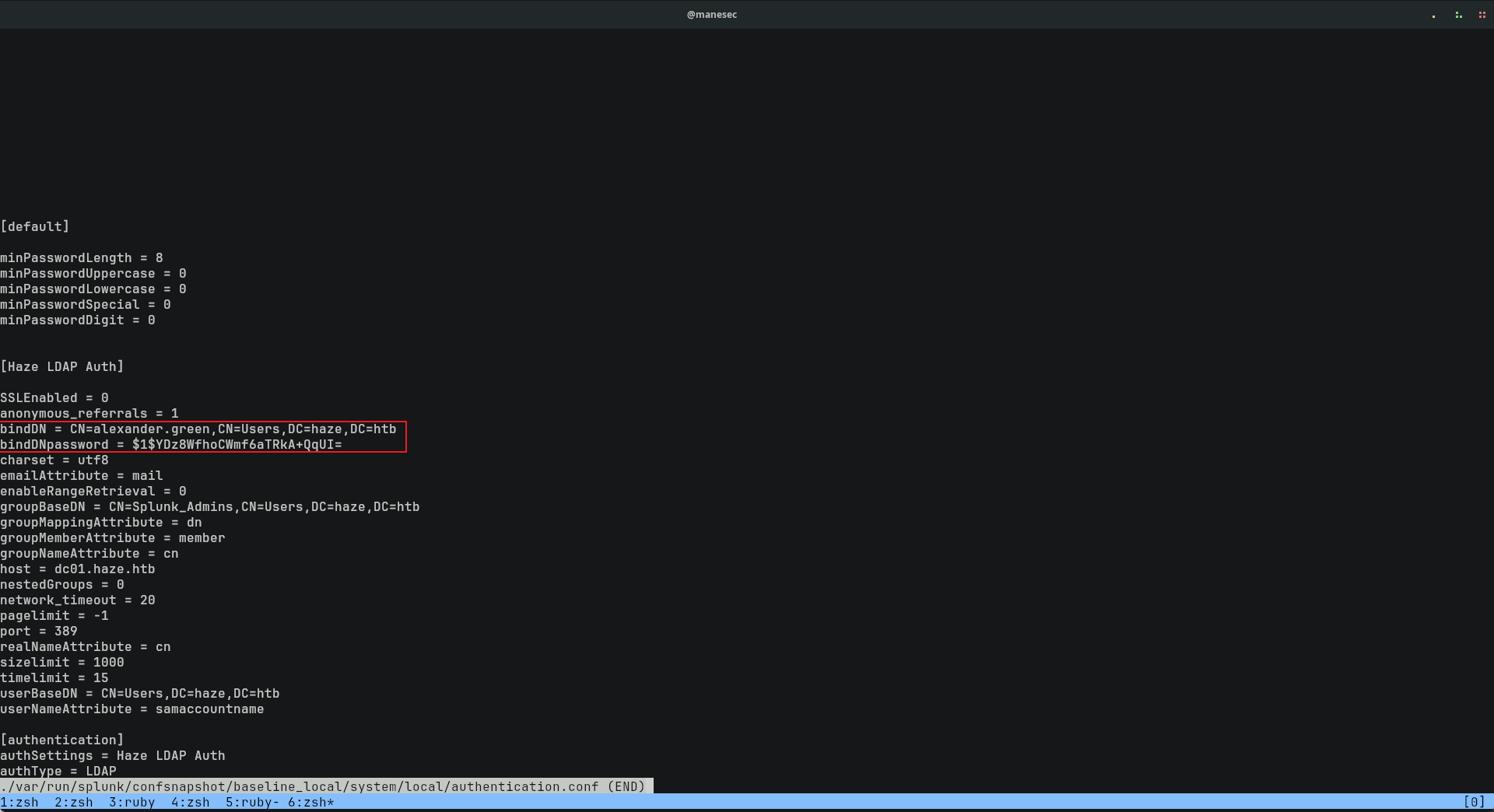 於是想到應該和ldap應該有一些關係,所以就嘗試尋找一下 splunk 的ldap配置文件,説不定有定義一些密碼: