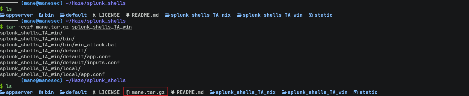 $ tar -cvzf mane.tar.gz splunk_shells_TA_win