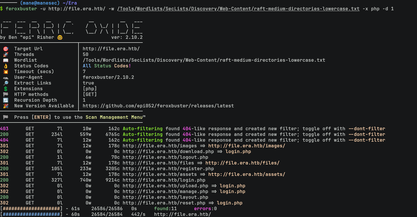 $ feroxbuster -u http://file.era.htb/ -w /Tools/Wordlists/SecLists/Discovery/Web-Content/raft-medium-directories-lowercase.txt -x php -d 1