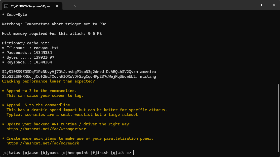 $ hashcat hash.txt rockyou.txt -m 3200