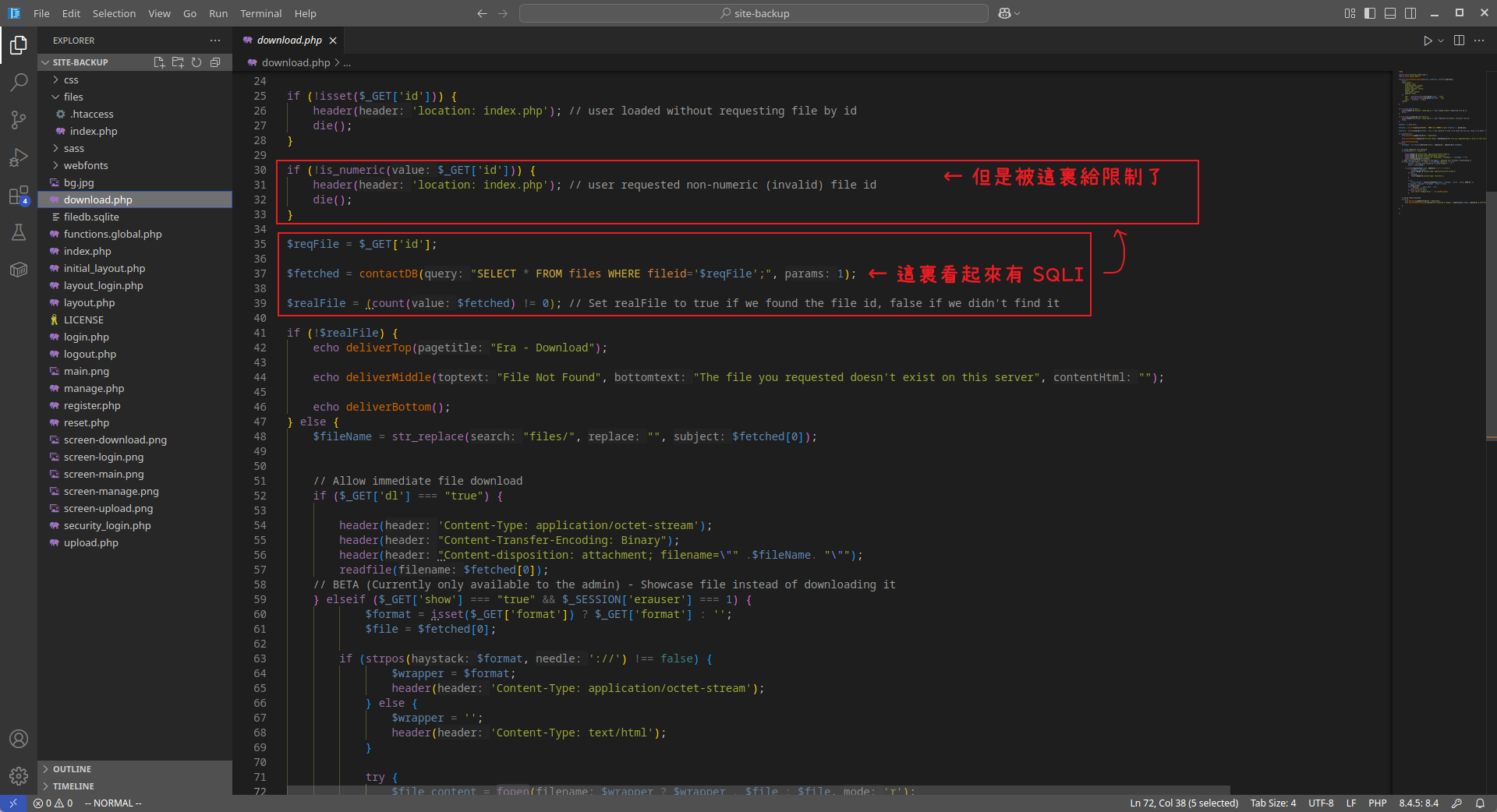 然後看一下下載的功能,一開始看到有一個很明顯的 SQL Injection,但是上面的傳遞 id 的參數中只允許是數字: