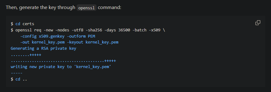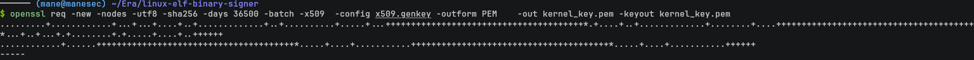 $ openssl req -new -nodes -utf8 -sha256 -days 36500 -batch -x509 -config x509.genkey -outform PEM -out kernel_key.pem -keyout kernel_key.pem